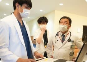 起床してすぐにプロテインを摂取して、早めに出勤するようにしています。当直帯での状況把握をして、チームカンファをして情報を共有します。上級医からのフィードバックを受けた後に、チームで朝回診をします。上級医との距離が近く、なんでも気軽に相談できるので日中の業務を円滑に進めることができます。